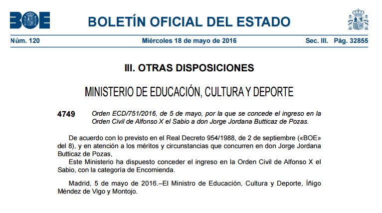 Jorge Jordana Butticaz de Pozas, ha ingresado en la Orden Civil de Alfonso X el Sabio en atención a sus méritos, según una Orden del Ministerio de Educación, Cultura y Deporte publicada en el BOE el pasado 18 de mayo de 2016.