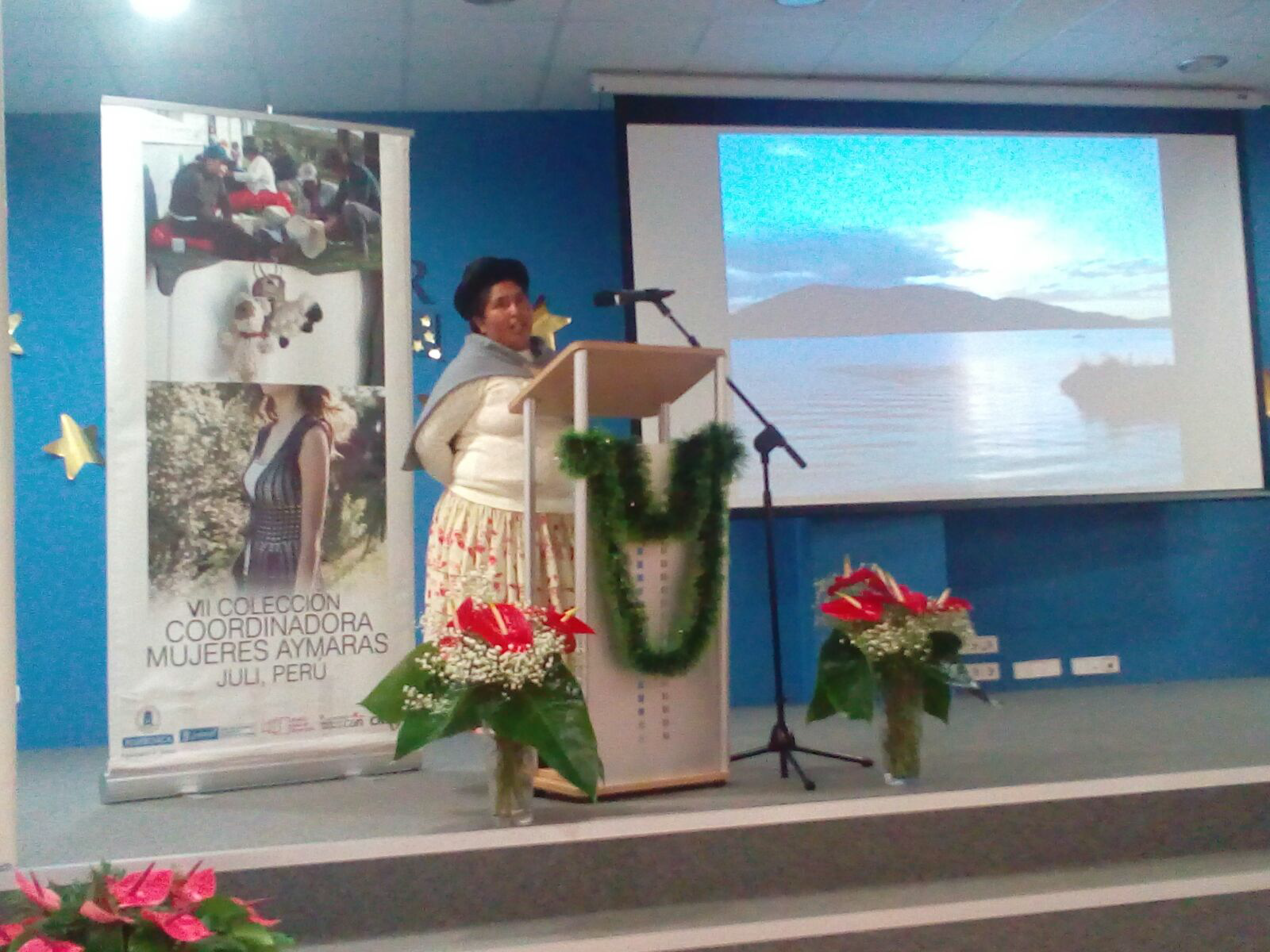 La Presidenta de la Coordinadora de Mujeres Aymaras (CMA) del Perú, Justina Montalico, ha estado en Madrid presentando el proyecto de colaboración que la CMA mantiene, desde hace varios años, con el Grupo de investigación Gesplan, de la Universidad Politécnica de Madrid. Las presentaciones han tenido lugar en la Escuela de Organización Industrial (EOI), a la que han asistido alumnos de Master de diversas áreas, y en la Escuela Técnica Superior de Ingeniería Agronómica, Alimentaria y de Biosistemas (ETSIAAB) de la Universidad Politécnica de Madrid, a la que han asistido los alumnos del Máster de Planificación de Proyectos de Desarrollo Rural y Gestión Sostenible. La presidenta también ha asistido a dos desfiles de la nueva colección de ropa que se han celebrado en el Colegio Mayor Guadalupe de Madrid y en el New Castelar College de San Pedro del Pinatar, Murcia.
