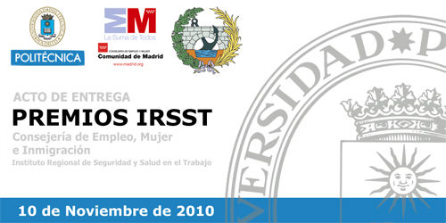 Ayer, día 10 de Noviembre de 2010, a las 19h. se celebró la entrega de los Premios IRSST 2010 a los mejores Proyectos Fin de Carrera (PFC). Esta acción se encuentra enmarcada en el convenio suscrito entre el IRSST- CAM y la UPM y donde se valora la integración de la prevención de riesgos laborales en los Proyectos Fin de Carrera presentados.